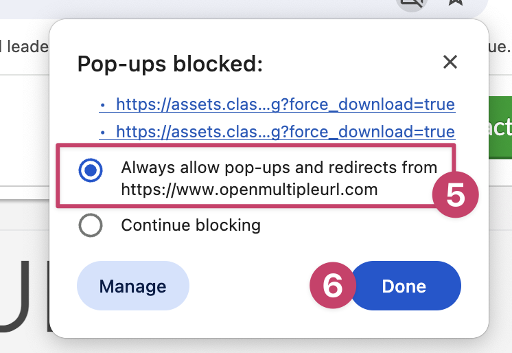 (b) Choose “Always allow pop-ups and redirects from https://www.openmultipleurl.com”